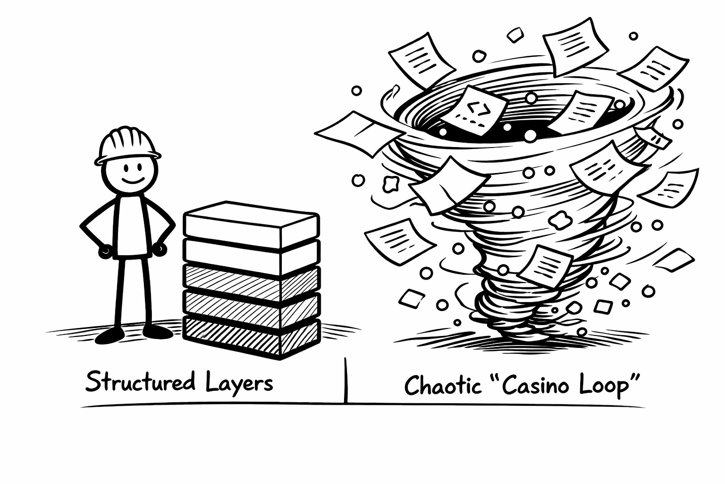 The first trap is the “casino loop.” They iterate endlessly with the AI, making small tweaks, running the code, tweaking again. It feels productive—you’re generating code, the screen is filling up—but you’re not building a system. You’re spinning in place. After hours of this, you’re exhausted, the codebase is a mess of conflicting patterns, and you have no clear path forward.